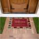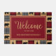 Robuuste "welkome" deurmat met een lappendeken van rode en zwarte buffels, wisselend met patches van een houten plankontwerp. Beren en pijnbomen worden in het patroon gemengd. Pas aan met "Welkom" en uw familienaam of een tekst die u kiest. Ideaal voor je berghuis.