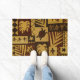 Welkom uw gasten-eilandstijl met deze Rusty Tapa-deurmat, met Hawaiian petroglyph-strijders en zeeen schildpadden die zijn geverfd in opvallende tinten van roesten en bruinen.