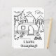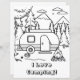 Schattigee kleurplaat met een met een campingthema. Een kampvuur en een camper kamperen in het bos.