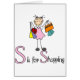 Een kaart met een meisjesstick en een tekst die luidt: "S is voor winkelen".