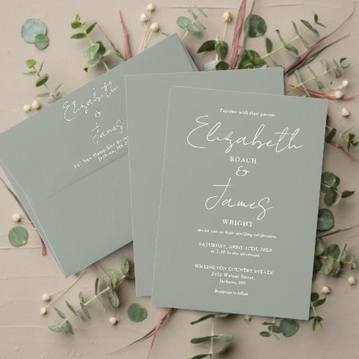 Simple Sage Green Script Wedding Invitation SuiteOntworpen door Pure Piglet Designs