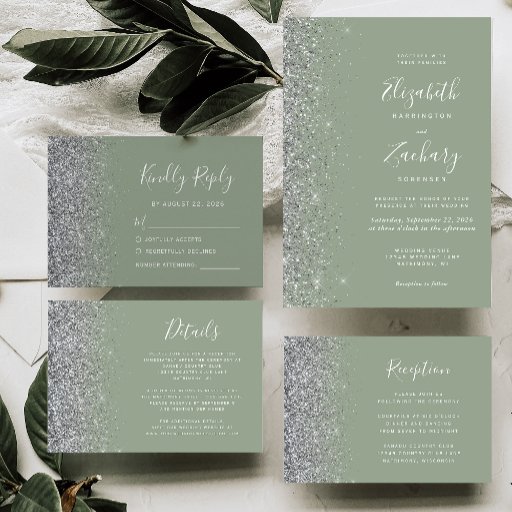 Silver Glitter Sage Green Script Wedding SuiteOntworpen door Akhates Designs