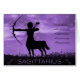 Een silhouet afbeelding van een Sagittariaans centrum tegen een paars-gekleurde hemelse achtergrond grijpt deze zodiakaart - versterkt door een lijst van de wonderlijke kwaliteiten van het Sagittarius astrologisch teken: Idealistisch, Humoureus, optimistisch, genereus, passief. Voeg je eigen persoonlijke bericht binnen toe - of laat desgewenst leeg. Ideaal voor een verjaardagskaart of een voltallige kaart.