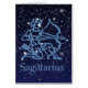 Kaart met het zodiale symbool voor Sagittarius in zacht zilverblauw, bedekt met de sterren van de constellatie, tegen een sterrenhemelachtergrond die van diep-middernacht blauw tot zwart wordt gegraveerd.