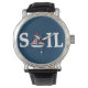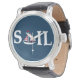 Tekstontwerp van de zagerij met decoratie op een donkerblauwe achtergrond voor zeilboten. Het is mogelijk om de achtergrondkleur te veranderen en verschillende aan het ontwerp met uw keus toe te voegen.