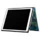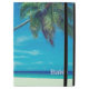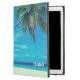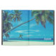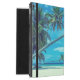 Een gepersonaliseerde iPad-hoesje met een foto met een tropisch thema met kokospalmen die zich uitstrekken over een afgelegen wit zandstrand. Turquoise wateren en een azuurblauwe lucht op de achtergrond.
