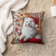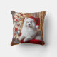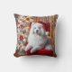 Een pluizige witte Samojeed hond met een kerstmuts zit op een rode stoel naast een prachtig versierde kerstboom.
