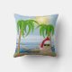 Schattigee Santa zandman op het strand met vakantieverlichting in palmbomen.