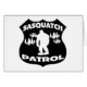 Groot zwart logo van de politie met "Sasquatch Patrol" in een simpel wit lettertype met een wit Sasquatch silhouet in het midden en een witte pijnboomachtergrond.