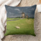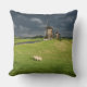 Fotokussen gooien kussens met een paar schapen in het groene gras voor drie windmolens onder een donkere hemel met regenwolken vlak voor een voorjaar storm in een landschap in Leidschendam, Nederland.