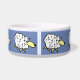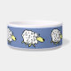 Het ontwerp van de cartoon van vun schapen herhaalde zich rond deze voedselbak voor gezelschapsdieren. Ideaal voor honden, vooral voor herdershonden. Blauwe achtergrond.