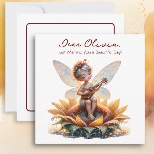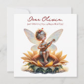 Ik wens iemand een goede dag met deze lege kaart. Schattigee kleine grillige anime fee meisje spelen van de ukelele bovenop een zonnebloem.