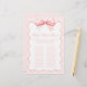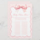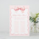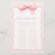 Ontdek onze charmante en elegante coquette-stijl baby girl shower baby naam race spelkaarten. Elke kaart heeft het hele alfabet voor het invullen van namen, versierd met een schattige roze strik, omgeven door een roze polkadot patroon. Perfect voor het toevoegen van een speelse touch aan uw baby shower festiviteiten, deze spelkaarten combineren grillig design met verfijnde charme.