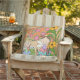 Kussen voor gebruik buitenshuis met een leuk, summier, schattig ontwerp met kleine tuinkerijen, paddenstoelen, groene kikkers en bloemen.