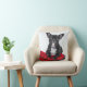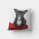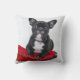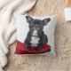 Schattige zwarte en witte buldog puppy zat op een regaal rood kussen.