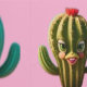 Kleine, schattige cactussen, elk in een unieke pot. Met ongewone, felle kleuren: sommige hebben delicate mintgroene tinten, terwijl anderen een zachte hemelsblauw dragen. Sommige hebben kleine bloemen op de top, zoals kransen van zonnegeel of felroze, hebben afgeronde vormen en een gezellige, vriendelijke uitstraling.