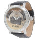 Schattige fawn kleurige pug puppy op een groot beige kussen en de bijschrift iCuddle op het gezicht van een mooi polshorloge.