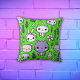Groene achtergrond met schattige paarse Kawaii personages en lavendelbloemen op dit vierkante kussen.