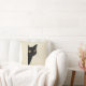 Een minimalistische zwarte kat die vanaf de zijkant van een lege witte pagina naar binnen kijkt met een helder, kleurrijk, minimaal ontwerp en licht pastelkleurig kussen.