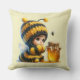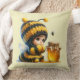 Kussen met een leuk afbeelding. Een meisje in een gehaakt bijenkostuum met een bij aan haar zijde. Kijken naar een pot honing.