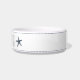 Cute coastal stijl hondenkom voor uw strandhuis of eilandverblijf met de woorden "strandhond" in rokerige havenblauwe boerderijstijl lettertype op een witte achtergrond, geaccentueerd met smalle marineblauwe strepen en een paar zeesterren.