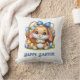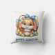 Schattige tekening van een zacht bruin en wit paashaas met slappe oren en een blauwe strik in haar haar, omgeven door kleurrijke, versierde eitjes. Gelukkig Pasen is geschreven in leuk lettertype onder de illustratie. Dit schattige gooi kussen is ook verkrijgbaar in een grotere maat.