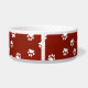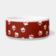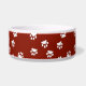 Deze grote hondenkom heeft een rode achtergrond met witte pootafdrukken erop. Grootte voor grotere hondenrassen. Het bevat 40 oz voedsel en is wit keramisch materiaal. Het is ook veilig voor de magnetron en de vaatwasmachine.