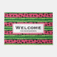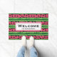 Welkom deurmat met een schattig watermeloenpatroon. Groene korst in lagen van strepen samen met een laag roze strepen met zwarte zaden binnenin. Leuk en zomerse design. Een rechthoek gelaagd op de top met jouw tekst binnen.
