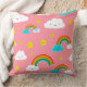 Kleurrijk naadloos patroon met lachende wolken, levendige regenbogen, gele sterren en blauwe wolken op een roze achtergrond. Dit vrolijke ontwerp is ideaal voor kinderproducten, achtergronden en creatieve projecten.