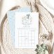 Sophisticated klassieke "Bingo" spel ontworpen voor een baby boy douche, versierd met een charmante ooievaar dragen baby jongen in een schattige kam en baby blauw gingham patroon aan de achterkant. Betrek uw gasten met dit heerlijke spel, perfect voor het toevoegen van plezier en opwinding aan uw feest terwijl u gekoesterde herinneringen creëert.