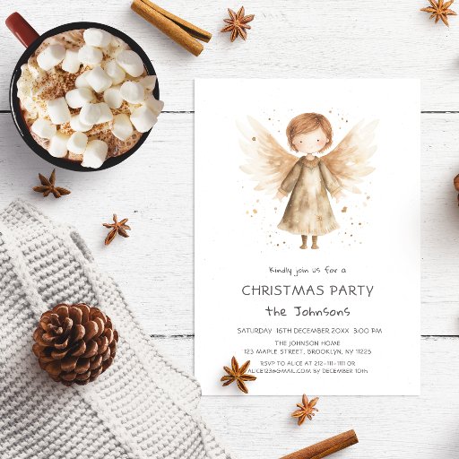 Schattigee Boho Beige Baby Angel Kerst Party Uitnodiging. De Merry Christmas Party uitnodiging in boho stijl met leuke kerstillustraties in zachte beige kleuren. Stijlvol en elegant ontwerp.