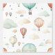 Schattige boho-geïnspireerd behang voor de kinderkamer van je baby met blauwe, rode en oranje heteluchtballonnen die tussen de wolken zweven.