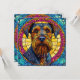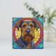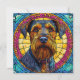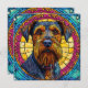 Portret van een hond met een dikke, bossige baard en expressieve ogen, omlijst door een levendige glas-in-loodachtige achtergrond in gele, roze en blauwe tinten.