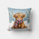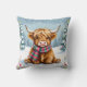 Dit schattige kerstkussen met seizoensgebonden worp heeft een ai-waterverf-achtige illustratie van een baby Highland-Koe die in een grillig besneeuwd veld zit tijdens een winterdag met een achtergrond van vakantie versierde pijnbomen.