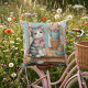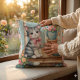 Schattigee kat op veranda met bloemen en patchwork kussen