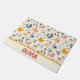 Gepersonaliseerde schattige kleurrijke kippen in het boerderij op een lichtgele deurmat op de achtergrond.