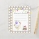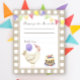 Een beetje Schattige kuiken. Waterverf kinderen verjaardagsfeestje. Waterverf schattige kip of haan in verjaardagstaart, pet met bessen, paarse ballon, feestelijke vlaggenslinger. Beige-bruine kooi achtergrond.