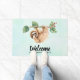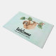 Welkom deurmat met een schattige luiaard die ondersteboven hangt van een boomtak. Boomtak is versierd met tropische bladeren en bessen. Zet op een lichtgroene achtergrond.