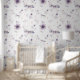 Schattige behang met paarse bloemetjes en strikjes op de witte achtergrond. Perfect voor meisjeskamer en kinderdagverblijven - Kate Eden Art