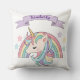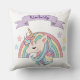 Dit schattige en kleurrijke custom worp kussen heeft een prachtige illustratie van een eenhoorn en pastelkleurige regenboog. Kleine sterren in bijpassende kleuren omringen de regenboog. Boven de eenhoorn is een banner afgedrukt met hieronder een voorbeeldnaam in een elegant paars schrift. U kunt het kussen personaliseren om uw eigen aangepaste naam of tekst op te nemen.