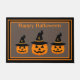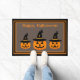 Een mooie en schattige Halloween Jack-o'-lantaarn en lachende snijwerk drie pompoenen dragen Witch's zwarte sinaasappels petten met vrolijke Halloween script en sinaasappels rand op zwart en bruin achtergrond Deur mat. U kunt de tekst en de kleur wijzigen door op Aanpassingsopties te klikken.