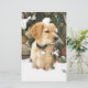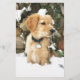 schattige gele gouden rekruter die in de sneeuw tegen de muur van de veldsteen speelt met een ijzel