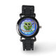 Dit horloge heeft een vector illustratie ontwerp met een schattige, decoratieve Uil in groene tinten op een wervelende tak. De achtergrond is een blauwe volle maan. Het kloknummerontwerp op dit horloge is een sjabloon object. Als je je horloge meer leuk vindt zonder hen, verwijder dan deze laag. Het is ook mogelijk om tekst toe te voegen zoals een naam of initialen.