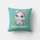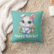 Schattigee tekening van een wit konijntje met grote blauwe ogen met een blauw paasei. De boodschap "Gelukkig Pasen" is onder de illustratie geschreven in een vet, wit en leuk lettertype. Verkrijgbaar in andere vormen en maten. Als je verandert van de grootte of vorm van het weergegeven kussen moet je het bekijken om te zien of je de resultaten leuk vindt.