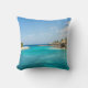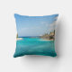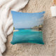Een kussen met een mooie foto met een tropisch strandoord. blauw water en witzandig strand met een ingesloten hut die het een kalm eilandvibe geeft.