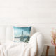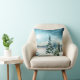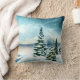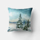 Een kussen met een prachtig waterverf schilderij. Pijnbomen bedekt met sneeuw in een winterse scène. Sneeuwvlokken vallen neer op een met sneeuw bedekte grond. Witte en blauwe pluizige wolken aan de hemel. Met een bevroren meer op de achtergrond. Vreedzame humeurige sfeer.