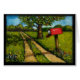 Mijn olieschilderij van een glanzend rood postvak met daarin een brief. De kalme, zonnige scène omvat een boom, velden, een rijstrook en wilde bloemen.