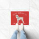 Schattige kerstdeurmat met een Schnauzer met een kerstmuts op een feestelijke rode achtergrond.