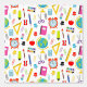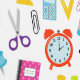School supplies pattern featuring globes, clocks and office supplies