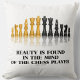 Stel uw existentiële schaakspeler naast deze gooikussens met een reflecterende schaakset samen met het gezegde "Beauty is gevonden in de geest van de schaakspeler" in. Een gedenkwaardige gooi een kussen voor elke schaakspeler die graag over schaak denkt wanneer hij een dutje doet!